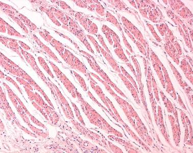 In der locker aufgebauten Tela submucosa des Ösophagus und der Kardia finden sich zahlreiche Anschnitte von Arteriolen, Venolen (meist mit Erythrozyten gefüllt), Kapillaren und peripheren Nerven (Plexus submucosus, Meissner-Plexus). Vereinzelt kann man auch die von Satellitenzellen begleiteten Ganglienzellen des Plexus submucosus beobachten. Sie sind durch große Zellen mit breitem, leicht basophilem Zytoplasmasaum und einem großen euchromatischen Kern mit deutlichem Nukleolus gekennzeichnet. Sie sind in dem hier abgebildeten Ausschnitt jedoch nicht eindeutig zu identifizieren. |