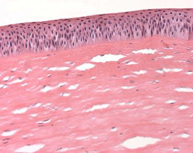 In der geringsten Vergrößerung dieses Präparats von der Hornhaut des Auges (Cornea) erkennt man eine innere konkave und eine äußere konvexe Seite. Auf der konvexen Seite befindet sich mehrschichtiges unverhorntes Plattenepithel. Die konkave Seite begrenzt ein einschichtiges Plattenepithel. Dazwischen liegt das Stroma corneae, die Substantia propria corneae, die 90% der Cornea ausmacht. Die Hornhaut ist frei von Blutgefäßen und besitzt viele freie Nervenendigungen, die afferent über den Nervus ophthalmicus, einem Ast des Nervus trigeminus (V. Hirnnerv) den Lidschlussreflex vermitteln. Die Cornea wird von hinten durch das Kammerwasser ernährt, lateral durch Blutgefäße der Konjunktiva. Vorn dient der Tränenfilm dem Schutz vor Austrocknung und der Versorgung des Epithels mit Nährstoffen. |