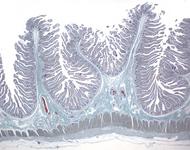 Präparat 59: Einschichtiges hochprismatisches Epithel, Kolon (Ratte), PAS-Färbung |