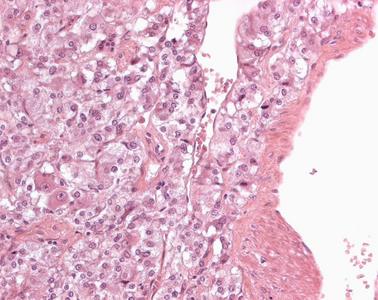 Das Nebennierenmark (Medulla glandulae suprarenalis) wird überwiegend von chromaffinen Zellen gebildet. Sie werden aufgrund ihrer Braunfärbung bei Behandlung mit Chromsalzen als chromaffin bezeichnet. Die Zellen besitzen ein helles, leicht granuliertes Zytoplasma und eine oder mehrere große Vakuolen (größer als die der Zona fasciculata). Die Zellen des Nebennierenmarkes produzieren Katecholamine (z.B. Adrenalin). |