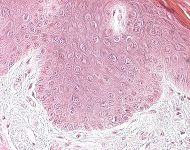 Bei höherer Vergrößerung lassen sich die Schichten der Epidermis unterscheiden: Stratum basale, Stratum spinosum, Stratum granulosum, Stratum lucidum, Stratum corneum. Stratum basale und Stratum spinosum werden als Stratum germinativum zusammengefasst. |