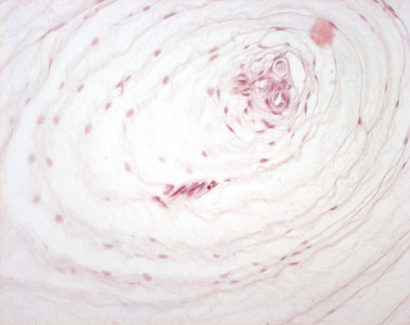 Die Vater-Pacini-Körperchen sind außen von einer aus Perineuralzellen (entstammen dem Perineurium) aufgebauten mehrschichtigen Kapsel umgeben. Die Kapsel ist in dieser Vergrößerung außen nicht mehr zu erkennen (siehe vorherige lichtmikroskopische Aufnahme). Die Perineuralzellen setzen sich nach innen weiter fort und bilden die äußere Lamellenschicht der Vater-Pacini-Körperchen. Diese konzentrisch angeordnete, zwiebelschalenartige Lamellenschicht besteht aus bis zu 50 Lagen flacher Perineuralzellen zwischen denen sich eine visköse Flüssigkeit aus Kollagenfibrillen und wasserbindenden Proteoglykanen befindet. Die Flüssigkeit ist entscheidend für die Funktion der Sinneskörperchen als Beschleunigungsdetektoren. Bei langsamen mechanischen Reizen kommt es zu Flüssigkeitsverschiebungen, wodurch der Reiz das zentral gelegene Axon nicht erreicht, sondern vorher abgepuffert wird. Aufgrund der Trägheit der Flüssigkeit werden schnelle mechanische Reize nicht abgepuffert und erreichen das Axon, welches daraufhin ein Rezeptorpotential generiert. |