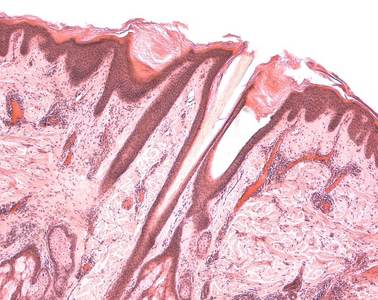 Auf der natürlichen Seite des Präparates erkennt man die Epidermis. Trichterförmige Einsenkungen der Epidermis reichen in die Tiefe, in jedem der Trichter findet sich ein Haar. Die Trichter enden in Form von sog. Haarzwiebeln (Bulbi pilorum) in der Subkutis. Unterhalb der Subkutis liegt die straff bindegewebige Galea aponeurotica (nicht in allen Präparaten zu sehen). Sie ist über kräftige Bindegewebsbrücken mit dem Stratum reticulare des Coriums verbunden; ihre Verbindung zu den darunterliegenden Knochen der Schädelkalotte ist schwach. Diese Konstruktion macht die Kopfhaut zu einem derben, beiderseits straff bindegewebigen Überzug des Schädels, dem Skalp, der sich leicht gegen den Schädel verschieben (und von ihm abziehen) läßt. |