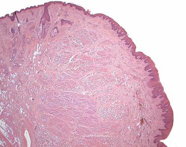 Die natürlichen Oberflächen des Organs werden von verschiedenen ineinander übergehenden Epithelien bedeckt. Im teils locker, teils dichten Bindegewebskörper des Lids befinden sich Anschnitte von Haaren, Talgdrüsen unterschiedlicher Größe und Lokalisation, große und kleine Arterien und Venen sowie Muskulatur. |