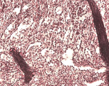 Bei stärkerer Vergrößerung erhält man einen guten Eindruck vom verzweigten, feinen Maschenwerk der Retikulinfasern, zwischen denen gegengefärbte Zellkerne liegen. Die Retikulinfasern durchsetzen die gesamte Milz, nur die Lumina der Blutgefäße und der Milzsinus bleiben von ihnen frei. Der weitere mikroskopische Aufbau der Milz läßt sich am Präparat 35 besser studieren. |