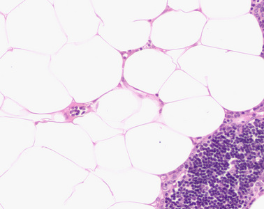Im Mark befinden sich die auffälligen Hassall-Körperchen in verschiedenen Zustandsformen und Größen. Die Hassall-Körperchen bestehen aus modifizierten Retikulumzellen mit großem leerem Zellkern und sehr deutlichem Nukleolus, die sich zu Gruppen zusammenlagern. Dabei umgeben die äußeren Zellen des Hassall-Körperchens die inneren zwiebelschalenartig. In den größeren Körperchen findet sich im Inneren oft Zelldetritus in Form von intensiv basophilen Punkten oder unregelmäßig strukturierten azidophilen Verklumpungen. |