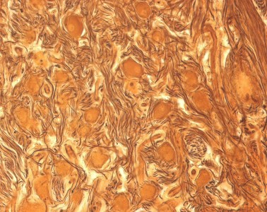 An diesem Präparat aus einem Ganglion des Grenzstrangs, Truncus sympathicus, sind die Nervenzellen mit der Cajal-Versilberung gefärbt (imprägniert). Wie Sie ja bereits bei Präparat 26 gelernt haben, besitzen Nervenzellen ein Perikaryon und unterschiedliche Fortsätze, die Dendriten und das Axon. Mit der Cajal-Versilberung werden Bestandteile des Zytoskeletts, die Neurofibrillen, tiefbraun bis schwarz angefärbt. Mit dem Elektronenmikroskop lassen sich Neurofibrillen in Neurofilamente und Neurotubuli auflösen. Die Neurofibrillen sind in den Axonen der Nervenzellen viel kompakter zusammengelagert als in den Dendriten und Perikaryen des Neurons. Die Axone erscheinen daher wesentlich dunkler als die Dendriten und die Perikaryen, die gelblich/braun gefärbt werden und nur am Rand versilberte Neurofibrillen zeigen. Der Zellkern der Neurone ist nicht angefärbt und erscheint daher als rundes helleres Gebilde im Perikaryon. Gliazellen (Satellitenzellen), die die Perikaryen umgeben, sind hier nicht eindeutig zu identifizieren. Eine andere Versilberungstechnik (nach Golgi) stellt selektiv einzelne Neurone mit der Gesamtheit ihrer Fortsätze dar (s. Präparat 92). Die Golgi-Versilberung erlaubt die eindeutige Klassifizierung in multipolare Nervenzellen, bipolare Neurone (mit nur einem Dendritenstamm und einem Axon) und pseudounipolaren Nervenzellen. Der Truncus sympathicus (Grenzstrang) ist Teil des vegetativen Nervensystems und liegt der Wirbelsäule an. Charakteristisch für ein vegetatives Ganglion sind zum einen die unterschiedlich großen, multipolaren Nervenzellen. Zum anderen ist die Lage der Gliazellen, welche die Perikarya der meisten Neurone im peripheren Nervensystem komplett einhüllen, in vegetativen Ganglien oft inkomplett. |