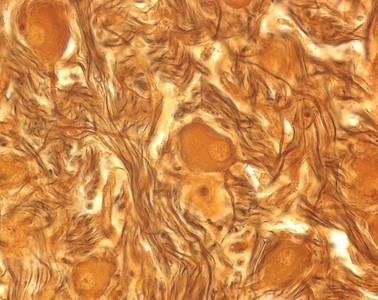 In hoher Vergrößerung werden unterschiedlich große, gelb/braun gefärbte Perikaryen sichtbar, bei einigen ist der Kern angeschnitten und als aufgehellter Bezirk im Perikaryon erkennbar. Die Nervenzellen sind in von einem dichten Geflecht von neurofibrillenreichen, schwarz/braun gefärbten Axonen umgeben, die teils längs, teils quer angeschnitten sind und häufig zu Bündeln zusammengefasst sind. Diese Bündel werden auch als Nervenfaserbündel bezeichnet. Anmerkung zur Nomenklatur: der Begriff Nervenfaser umfaßt das Axon (hier schwarz gefärbt) und seine Hülle aus Schwann-Zellen (Gliazellen) und das Endoneurium (beides hier nicht gefärbt), vgl. Präparat 29, 30). Von einigen Perikaryen gehen wesentlich größere Fortsätze ab, die deutlich weniger Neurofibrillen enthalten als die Axone und die den gleichen Farbton wie die Perikaryen haben. Hierbei handelt es sich um die Dendriten. |