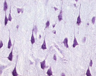 In der Nähe der Grenze zur weißen Substanz tauchen vermehrt schlanke, spindelförmige bipolare Perikaryen mit einander gegenüberliegenden Dendritenstümpfen auf. Dort findet man auch die rundlichen oder polygonalen Zellleiber von multipolaren Zellen, deren Dendritenstümpfe in verschiedensten Richtungen aus den Zellleibern herausragen. In der weißen Substanz, die in der Nissl-Färbung annähernd strukturlos erscheint, findet man fast ausschließlich blasse Gliazellkerne. Bei den Gliazellen der weißen Substanz handelt es sich überwiegend um fibrilläre Astrozyten und Oligodendrozyten. Die Zellkerne der Oligodendrozyten liegen in einem ungefärbten Zellleib, die Zellen ordnen sich parallel zur Textur der Axone der weißen Substanz in Reihen an. |