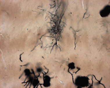 Dieses Präparat zeigt eine Versilberung nach Golgi, durch die einzelne Nervenzellen mit der Gesamtheit ihrer Fortsätze dargestellt werden können. Die Versilberung nach Golgi ist allerdings eine trickreiche Methode mit unvorhersehbaren Ergebnissen: die Silbersalze schlagen sich häufig nicht nur an der Oberfläche einzelner Nervenzellen nieder (wie zu ihrer Darstellung gewünscht), sondern z. B. auch an den Kapillaren. An einigen Stellen finden sich große Konglomerate von Silberniederschlägen, hier liegen die gefärbten Strukturen so dicht beieinander, dass einzelne Zellen im schwarzen Zentrum nicht aufgelöst werden können, an der Peripherie solcher Konglomerate kann man allerdings feine und feinste Fortsätze von Neuronen und Gliazellen erkennen. |
