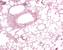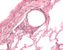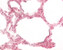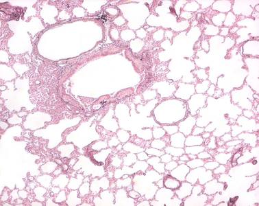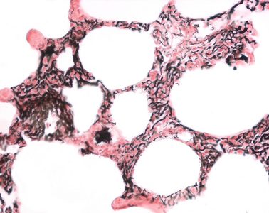 In diesem Präparat wurde das Gefäßsystem der Lunge dargestellt durch Injektion von Tusche in die großen Gefäße. Das Lungenparenchym wurde durch Gegenfärbung mit Kernechtrot sichtbar gemacht. Zu erkennen sind tuschegefüllte Lungenvenen, Vv. pulmonales (einzeln im Parenchym verlaufend), Lungenarterien, Aa. pulmonales (in der Nachbarschaft der Bronchi und Bronchioli) und die Kapillaren in Interalveolarsepten. |