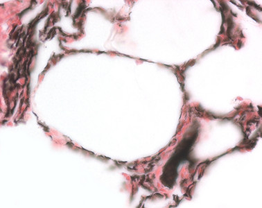 Lungenbläschen mit einem Durchmesser von 250-300 µm. Ihre innere Oberfläche wird von flachen Plattenepithelzellen gebildet (Alveolarepithelzellen Typ I, synonym: Pneumozyt Typ I). Neben den Alveolarepithelzellen Typ I gibt es größere, isoprismatische Epithelzellen (Alveolarepithelzellen Typ II, synonym: Pneumozyt Typ II). Benachbarte Alveolen sind durch ein gemeinsames bindegewebiges Septum interalveolare voneinander getrennt, das neben elastischen Fasernetzen und Fibrozyten, Makrophagen, Mastzellen und Leukozyten vor allem die Kapillarverzweigungen der A. pulmonalis enthält. Alveolarepithelzellen Typ I bilden gemeinsam mit dem Endothel der Kapillaren und einer einzigen Basallamina die Blut-Luft-Schranke. |