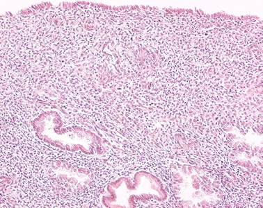 Wandausschnitt des Uterus. Im oberen Bildteil ist das Endometrium (Schleimhaut des Uterus) zu erkennen, das sich in ein an das Lumen grenzende Stratum functionale und ein darunter gelegenes Stratum basale gliedert. Im unteren Bildteil ist die kräftige Muskelschicht, das Myometrium zu sehen. |