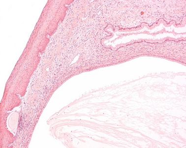 Das Präparat zeigt einen gekrümmten Wandabschnitt zweier ineinander übergehender Organe mit unterschiedlichen Oberflächenepithelien. In der Vagina (links) befindet sich mehrschichtiges unverhorntes Plattenepithel, im Uterus ein einschichtiges hochprismatisches Epithel mit Drüsen. Im Übergangsbereich zwischen Uterus und Vagina liegen unter dem Epithel gelegentlich (hier abgebildet) bereits makroskopisch erkennbare Hohlräume: Ovula Nabothi (Nabothsche Eierchen, sie wurden von Martin Naboth fälschlicherweise für die Oozyten des Menschen gehalten). |