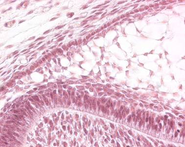In diesem Ausschnitt ist oben das Schmelzorgan (Zahnglocke) und unten die Zahnpapille zu erkennen. Die Zahnglocke wird nach außen durch das äußere Schmelzepithel (flach, isoprismatisch) gegen das mesenchymale Zahnsäckchen abgegrenzt. Die innere Oberfläche der Zahnglocke wird durch das hochprismatische innere Schmelzepithel ausgekleidet, das der Zahnpapille aus dichtem Mesenchym zugewandt ist. Zwischen dem inneren und äußeren Schmelzepithel befindet sich die Schmelzpulpa; hier liegen sternförmige Zellen in weiten Interzellularräumen. |