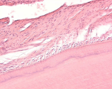Dentin erscheint bei offener Kondensorblende fast strukturlos, beim Schließen der Blende wird die feine, typische Radiärstreifung des Dentins sichtbar. Diese Streifung wird durch feine Kanälchen im Dentin erzeugt, in denen Zellfortsätze (Tomes-Fasern) der dentinbildenden Odontoblasten verlaufen. Die Zellleiber der Odontoblasten sind nicht in das Dentin eingemauert, sie sind palisadenförmig an der Grenze zum Dentin aufgereiht und gehören zur Zahnpulpa, die im Inneren lockeres Bindegewebe mit freien Zellen, Gefäßen und Nerven enthält. |