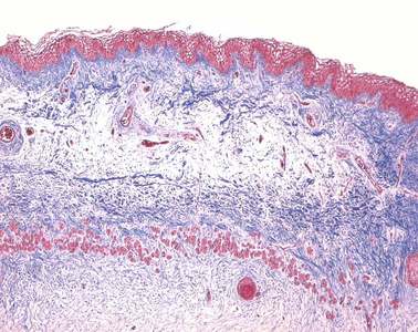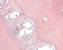 Dieses Präparat zeigt eine Zahnanlage, die weiter entwickelt ist als die im Präparat 45. Am oberen Präparatrand ist das mehrschichtig unverhornte Plattenepithel der Mundhöhle zu erkennen. Unten und seitlich wird die Zahnanlage von Alvelolarknochen umgeben, die Knochensubstanz ist blau gefärbt. Im Bereich der späteren Krone sind die Schmelz bildenden Zellen, die Adamantoblasten, als rote Kappe zu erkennen, die einen optisch leeren Raum umgreift. Dieser Raum markiert die Schmelzschicht; er entsteht dadurch, dass der Schmelz bei der Präparation herausgelöst wurde. An die Schmelzschicht grenzt die hier blau gefärbte Dentinschicht, unter der Dentinschicht liegt die Zahnpulpa. Der Hohlraum zwischen Zahnpulpa und Dentin ist ein Artefakt. |