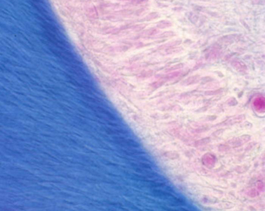 Am linken Bildrand ist die Zahnpulpa mit den pallisadenförmig angeordneten Odontoblasten zu erkennen. Die Odontoblasten bilden zum äußeren Schmelzepithel hin lange Fortsätze aus und geben unverkalkte Vorstufen des Dentins (Prädentin) in den Extrazellularraum ab, durch Mineralisierung entsteht aus dem Prädentin das Dentin. |