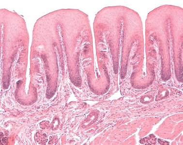 Die Papillae foliatae befinden sich im hinteren Bereich des seitlichen Zungenrands (Margo linguae), beim Menschen sind sie nur undeutlich ausgebildet. An ihrer Oberfläche befindet sich mehrschichtiges unverhorntes Plattenepithel. Benachbarte Papillen sind durch Gräben voneinander getrennt. An den seitlichen Wandungen der Papillen befinden sich Geschmacksknospen im Epithel. Die Papillae foliatae sitzen auf breitbasigen Bindegewebspapillen (primäre Bindegewebspapillen) der Lamina propria. Von den primären Bindegewebspapillen falten sich sekundäre Bindegewebspapillen auf, die an das Stratum basale des Epithels reichen. Am Boden der Gräben münden Ausführungsgänge (mehrreihiges hochprismatisches Epithel) von serösen Spüldrüsen, deren Endstücke teils in der Lamina propria, teils zwischen der Binnenmuskulatur der Zunge liegen. Zwischen den Muskelzügen liegen auch große Pakete fast rein muköser Drüsen. |