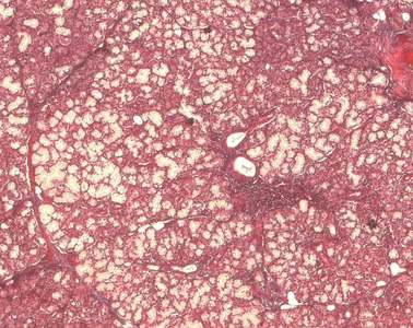 Die Streifenstücke sind so intensiv rot gefärbt, dass man ihre basale Streifung kaum erkennen kann. DD: Eine Verwechslung mit anderen Mundspeicheldrüsen, besonders der Glandula sublingualis ist möglich. Typisch für die Glandula submandibularis: gemischt seromuköse Drüse mit Überwiegen der serösen Anteile. |
